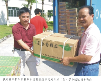 2009年8月18日,在東源縣縣委副書記劉立威的帶領(lǐng)下,東源縣總工會“關(guān)愛健康,送清涼”行動小組為我司送上了菊花茶、夏桑菊等一批消暑降溫物品。行動小組受到了我司董事長朱日楊等人的熱情接待,朱董事長認為,“送清涼”行動充分體現(xiàn)了上級領(lǐng)導部門對企業(yè)員工貼心的關(guān)懷,并代表全體‘霸王花’人對此表示衷心地感謝。